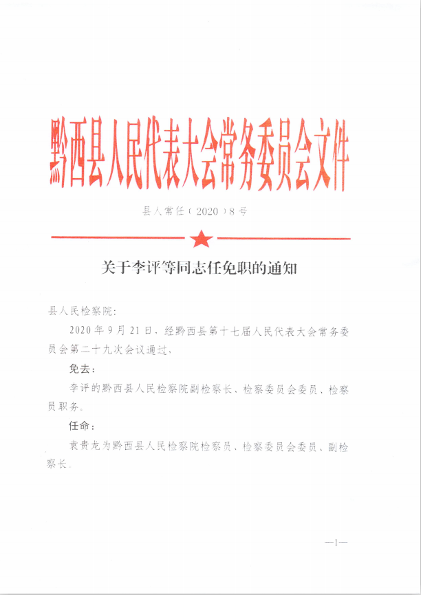 关于李评等同志任免职的通知(县人常任﹝2020﹞8号)